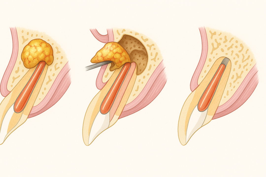 「歯根端切除術」は、歯茎の外側を外科的に切開し、炎症を引き起こしている歯の根と膿の袋を完全に取り除く治療法です。